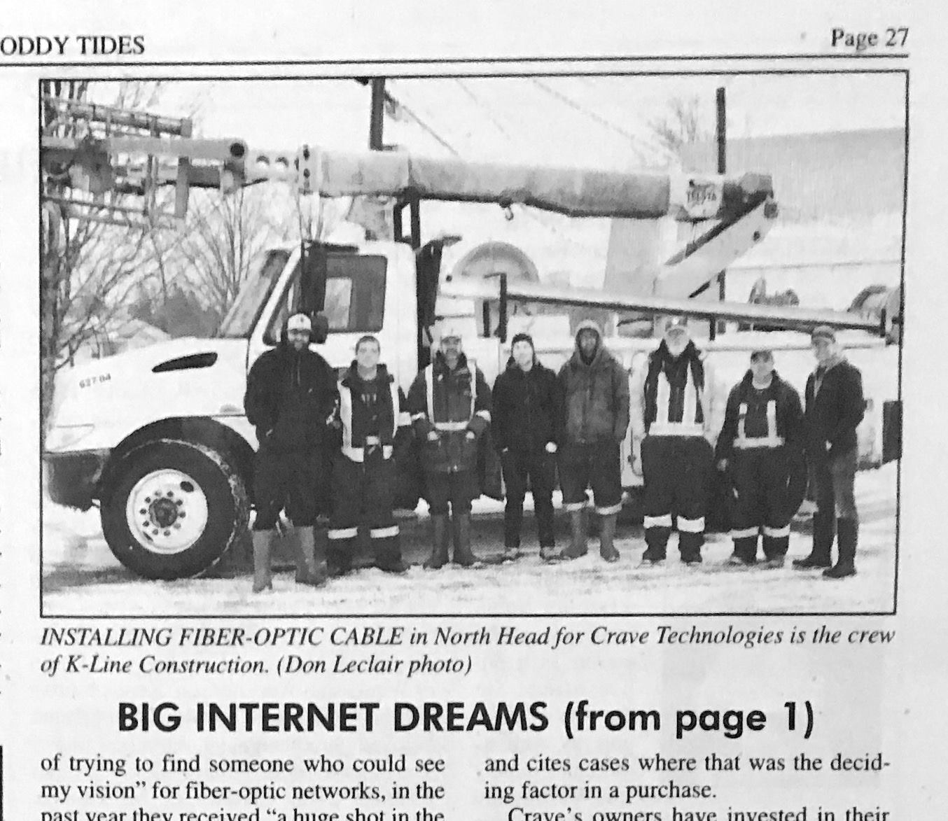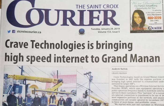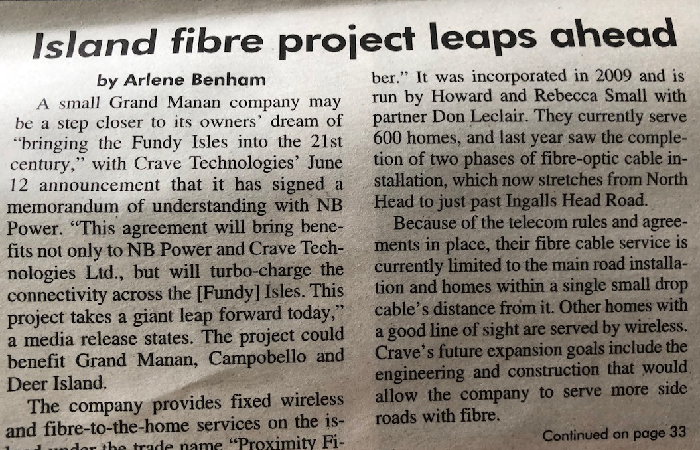 We were recently featured in the St. Croix Courier. See the article Crave Technologies working to bring high speed internet to Fundy Isles for more details about our fibre-to-the-home (FTTH) expansion plans in the Fundy Isles how our recent agreement with NB Power will play a role in those plans.