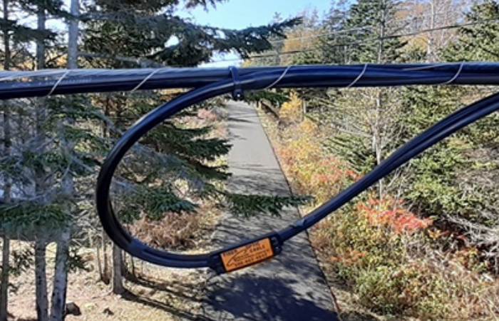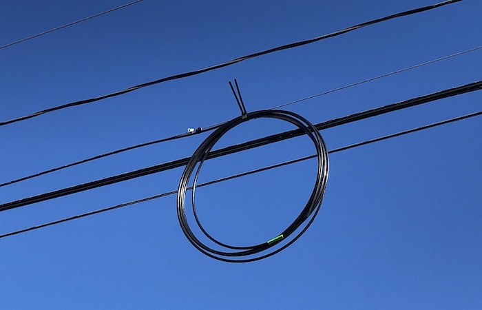 If you've been driving around our area of coverage you might have noticed one or more of these coils. Our construction crews left these intentionally so we can pull the fiber down into our splicing trailer and make local connections. Once the splicing phase is done they will be replaced with much smaller slack loops.